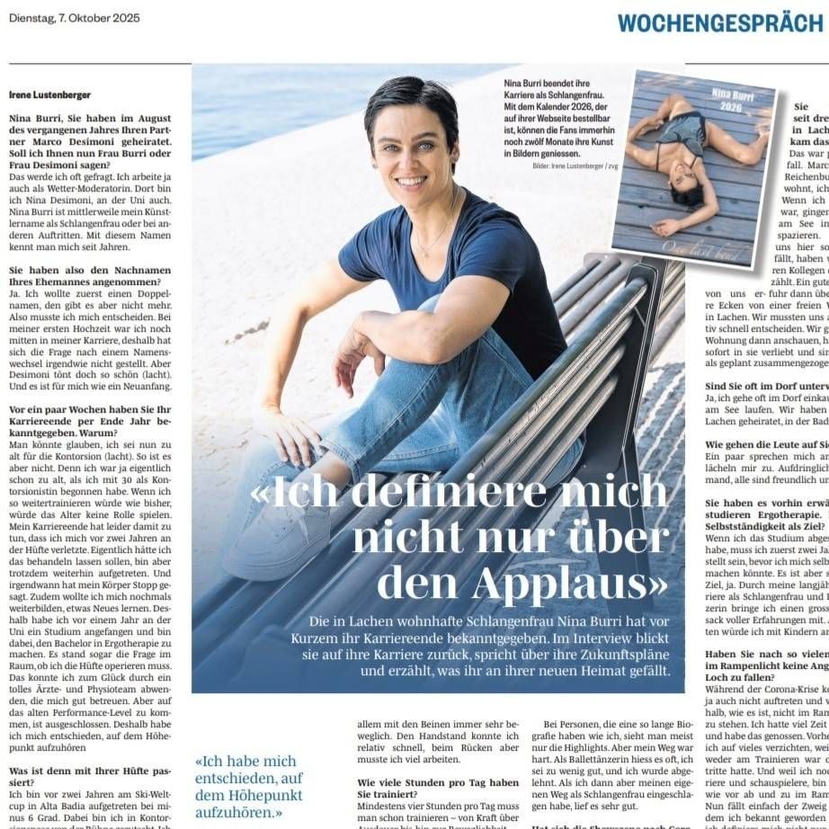 Nina Burri ist auch Speakerin und Moderatorin. Sie wird Ihren Event, Talk oder Podcast mit präziser Vorbereitung, unterhaltsam und mehrsprachig, ins beste Licht rücken. Seit kurzem ist sie auch wieder auf der Musicalbühne zu sehen, wo sie nicht nur ihr Bewegungstalent einbringt, sondern ihre Rolle auch mit Gesang und Schauspielerei lebendig macht.