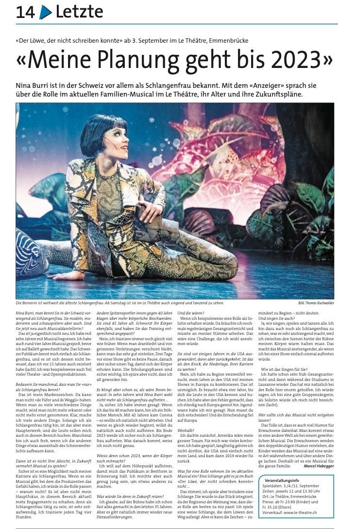 - Der Löwe, der nicht schreiben konnte! , Musical, Bernhard Theater Zurich, “Schlange”, 2020